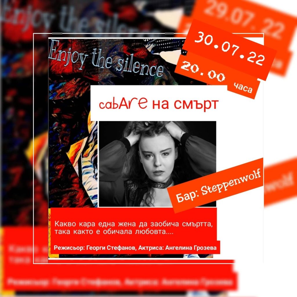 „CabAre на смърт“ е първият моноспектакъл на младата актриса и журналист Ангелина Грозева! Режисьор е Георги Стефанов, а премиерата ще се състои на 30 юли 2022 г. в бар Steppenwolf в София от 20:00 ч. Представлението е комбинация от драматургията на едноактната пиеса на Деян Дуковски – „Малколм Мухарем“ и популярният филм на Боб Фос – „Кабаре“.