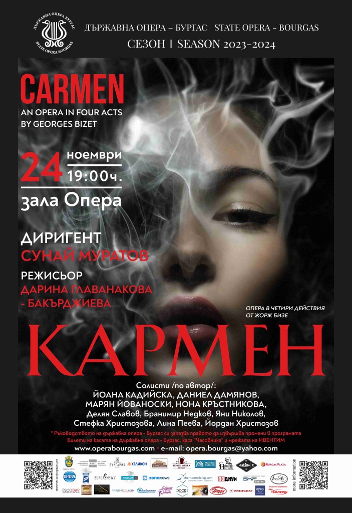 Билети за „Кармен“– на касата на Операта, каса „Часовника„, както и в мрежите на Grabo – https://grabo.bg/burgas/operata-karmen-0hzdg и Eventim – https://www.eventim.bg/bg/bileti/drzhavna-opera-burgas-zala-opera-burgas-1374052/performance.html.