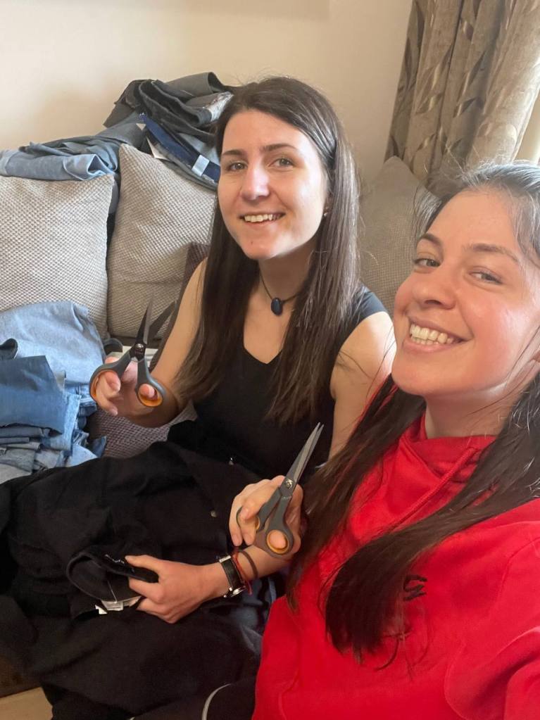- Подготовката на материалите за ушиване на дрехите – в продължение на 2 дни рязахме 3 чувала пълни с дънки. Оказа се доста по-трудно, отколкото си представяхме и не си усещахме ръцете след това. Но пък беше супер забавно.
