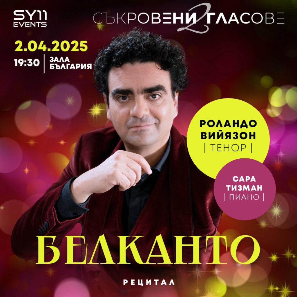 Емблематичният мексикански тенор Роландо Вийязон е добре познат на родната публика, а гостуването му в София е второ поред. Очакваме го в зала „България“ на 2 април 2025 г. с рецитала „Белканто“, където отново ще чуем пианистката Сара Тизман като акомпанятор на прочутия артист, който ще изпълни арии на Верди, Пучини, Белини, както и познати мелодии на известни съвременни мексикански композитори.