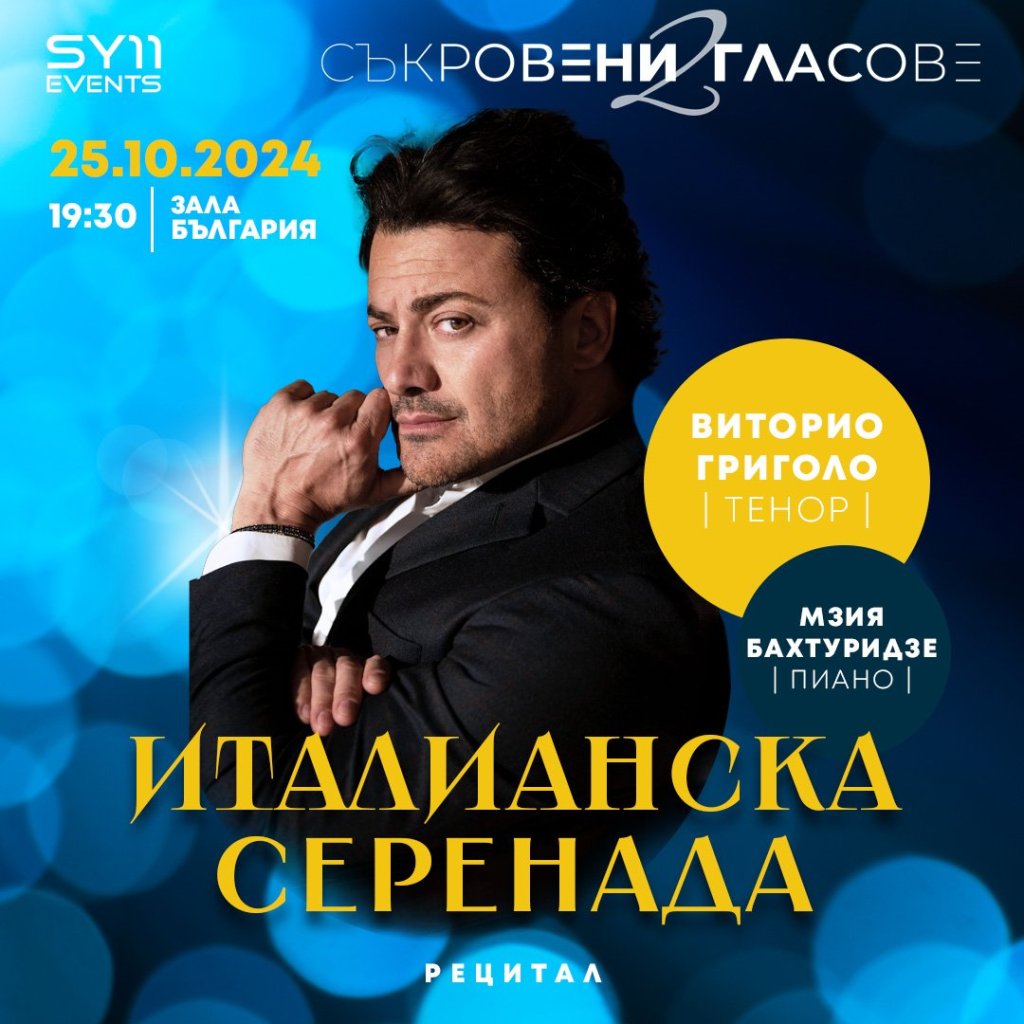 Началото на новия сезон ще бъде дадено на 25 октомври с рецитала „Италианска серенада“ на водещия тенор от Апенините Виторио Григоло. От дете той пее като солист в хора на Сикстинската капела, а по-късно дебютира в ролята на Овчарчето в „Тоска“ заедно с Лучано Павароти. Григоло е сред най-младите мъже-изпълнители, дебютирал само на 23-годишна възраст в Миланската скала с концерт под диригентството на маестро Рикардо Мути. Покорявал е сцените на най-престижните театри във Верона, Мюнхен, Берлин, Барселона, Ню Йорк, Париж, Лондон, Виена. Изпълнявал е главни роли в италианския и френски оперен репертоар с постановки като „Кармен“, „Дон Карлос“, „Фауст“, „Трубадур“, „Бохеми“, „Травиата“, „Хофманови разкази“, „Лучия ди Ламермур“, „Манон“, „Риголето“, „Ромео и Жулиета“, „Тоска“. Сред най-актуалните му превъплъщения през настоящия сезон са Канио в „Палячи“ в Държавната опера в Хамбург и Манрико в „Трубадур“ в Баварската държавна опера в Мюнхен.