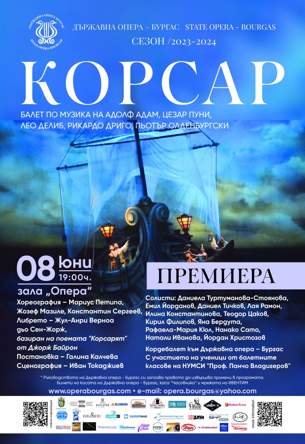 След безспорния успех на балетите: „Пахита“ – през 2020 г., „Жизел“ – през 2021 г., „Дон Кихот“ – през летния сезон на 2022 г. и „Зле опазеното момиче“ – през м. април 2023 г., за ценителите на изящното танцово изкуство Бургаската опера е подготвила ново премиерно заглавие в репертоара си – за първи път на сцената на бургаския културен институт ще бъде представен балетът „Корсар“ по музика на Адолф Адам, Цезар Пуни, Лео Делиб, Рикардо Дриго, Пьотър Олденбургски. Хореографията е на Мариус Петипа, Жозеф Мазиле, Константин Сергеев, либретото – дело на Жул-Анри Верноа дьо Сен-Жорж, базирано на поемата „Корсарят“ от Джордж Байрон.